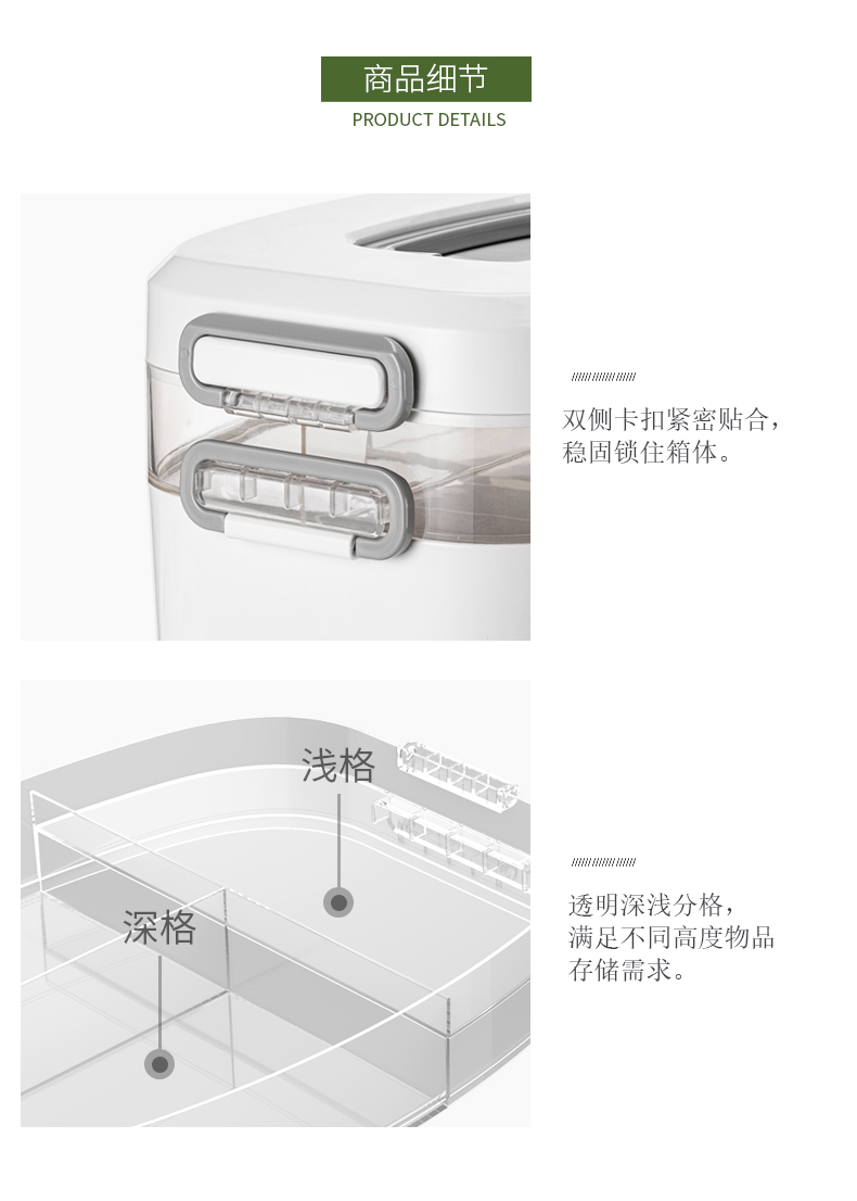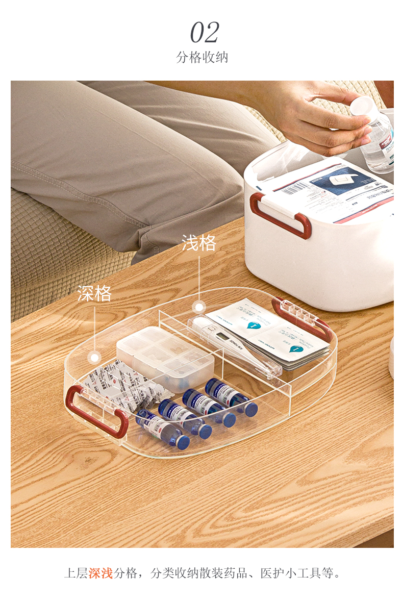 1、分格收納:上層不同深度分格,分類(lèi)收納散裝藥品
