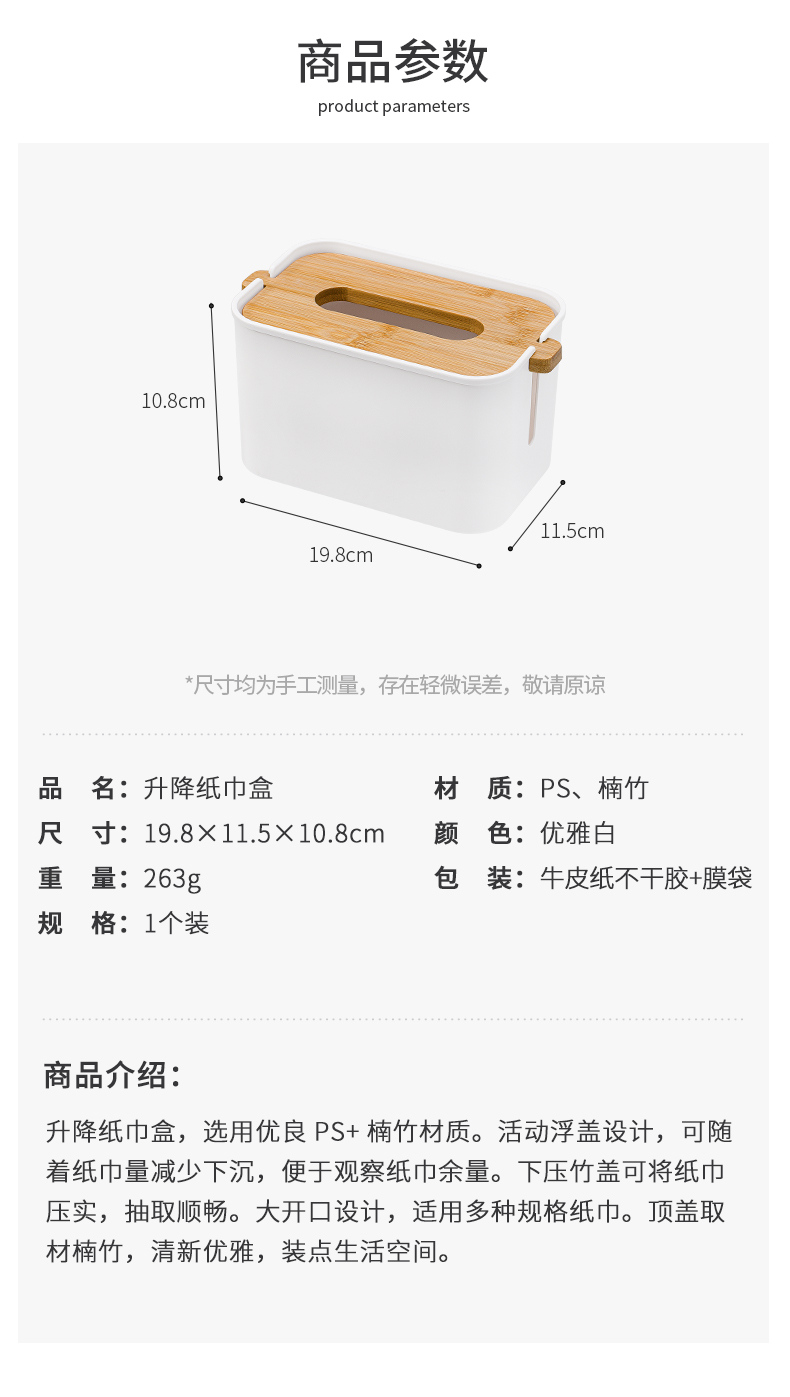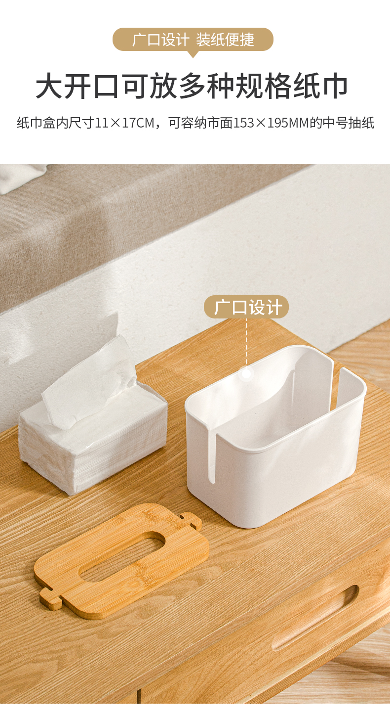 3、廣口設(shè)計(jì):大開(kāi)口可放多種規(guī)格紙巾